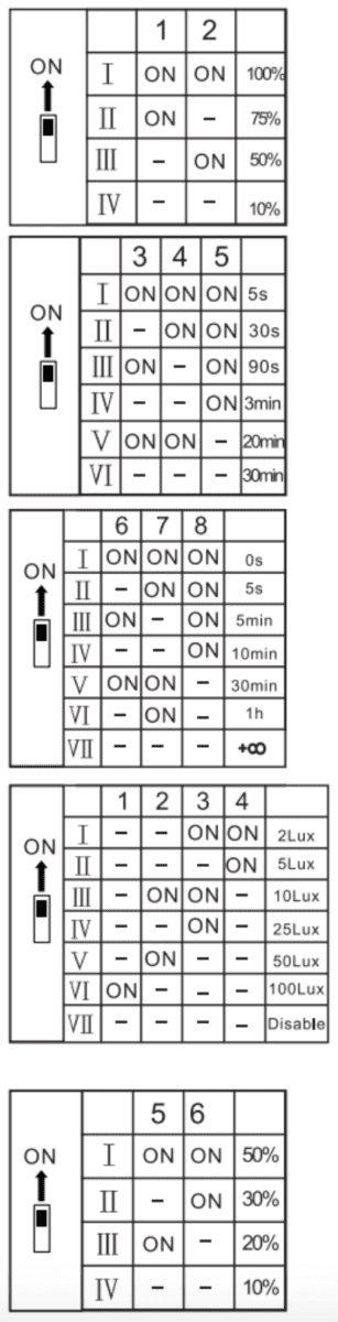Each sensor has the ability to customize detection area, hold time, and standby periods by using DIP switches. It is important to note that, when reducing the detection area, the sensitivity of the sensors will also be reduced.