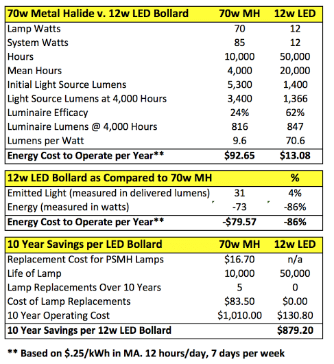 First, let us examine the price of the two bollard lights. The LED bollard costs less than the metal halide bollard. Much LESS. Production of LEDs / LED lighs is becoming increasingly efficient, leading to falling prices as performance improves.