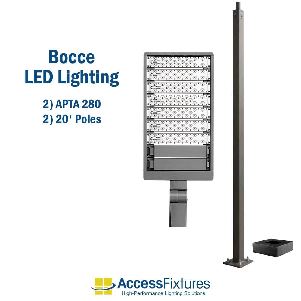 The Bocce LED Lighting with 2 Poles 13′ x 90′ Court – 10 fc 2.81 max/min is a bocce court lighting solution for homeowners and recreational facilities.