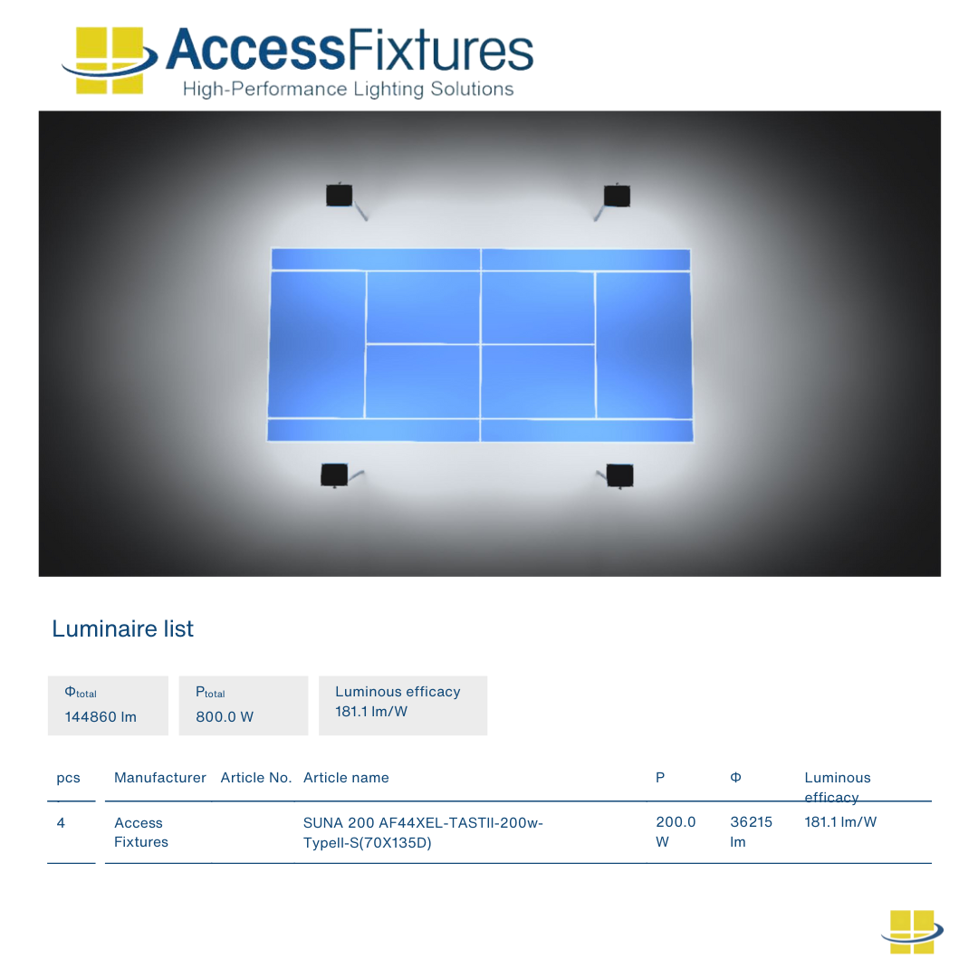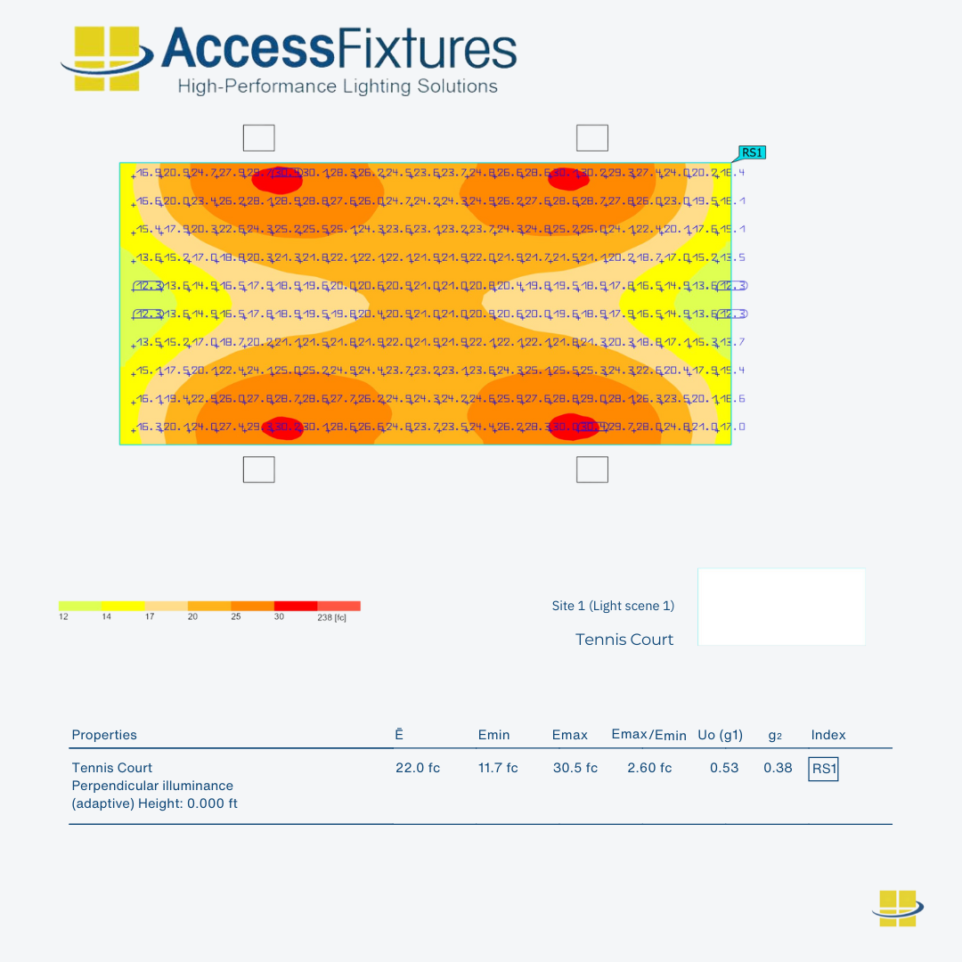 Proper Planning: Proper planning is essential for meeting tennis court lighting requirements. Access Fixtures lighting specialists can provide pre-engineered packages or custom photometric studies tailored to your court layout and level of play. Ensure your project delivers safe, uniform, and high-performance lighting. Contact a Lighting Specialist today.