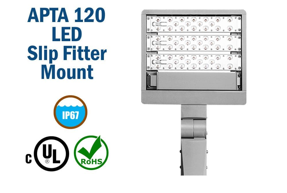 APTA LED lights are the best in class when it comes to longevity and durability. Made for outdoor lighting projects such as tennis courts and public parks, the APTA is L70 rated at over 200,000 hours. Poles are available in multiple heights and come in steel, aluminum, and fiberglass. They are IP67 rated, meaning they are fully enclosed, dustproof, and waterproof. The APTA is a bold lighting solution for a playground when visibility is the main concern as these fixtures are available at higher wattages than the VAND and the decorative post lights. APTA area lights are available with a choice of many different optic types to distribute the light exactly where it is needed. These lights can also be powered by solar energy, requiring only two hours of direct sunlight for charging.