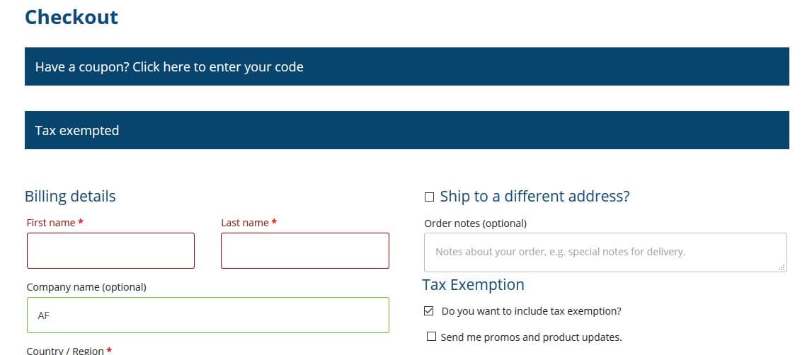 2) When approved, a checkbox will appear on the Checkout page when placing an order with the text "Do you want to include tax exemption?". The customer can apply the tax exemption by checking the box. Once that is done, no taxes will be calculated on the order.