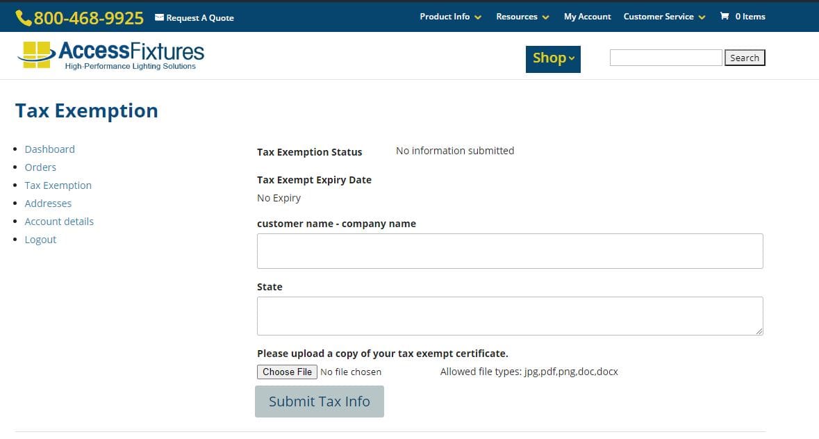 1) If a customer needs to use their tax exemption in either of those two states, they will have to provide a copy of the Tax Exemption certificate to Access Fixtures before completing an on-line order. Access Fixtures will approve the Tax Exemption. If you don't already have an account with AF, AF will create an account for you.